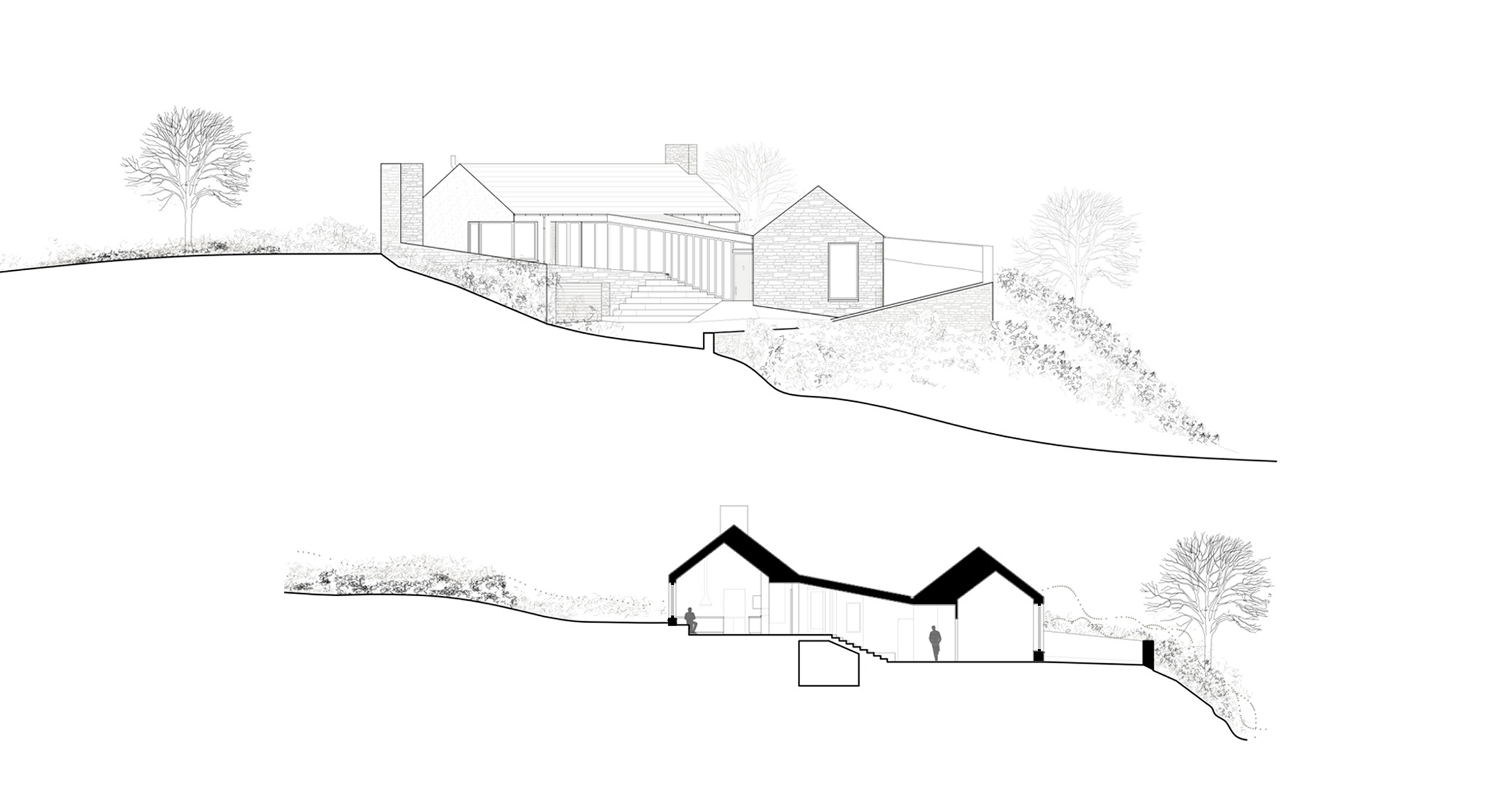 The house begins with a reconsolidated dry stone wall, which sites the house in relation to the ancient field lines and long disappeared 18th century homesteads. The living and sleeping spaces step up across and settle into natural terraces within the hillside, helping mediate between the internal spaces and their immediate landscape. The orientation of these rooms is derived from the path of the sun and the capture of prominent views, which lends this cluster of buildings and external spaces an informal vernacular character.
