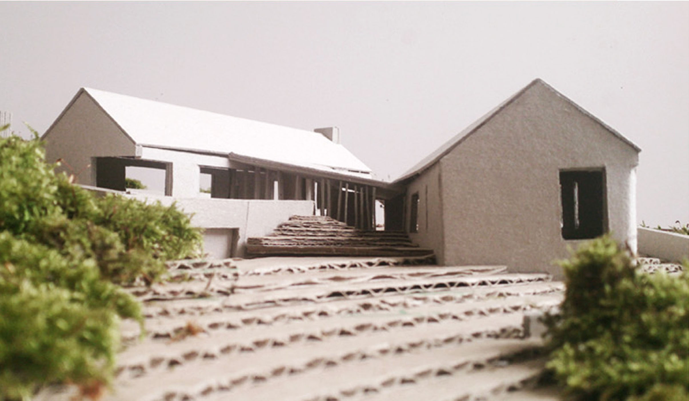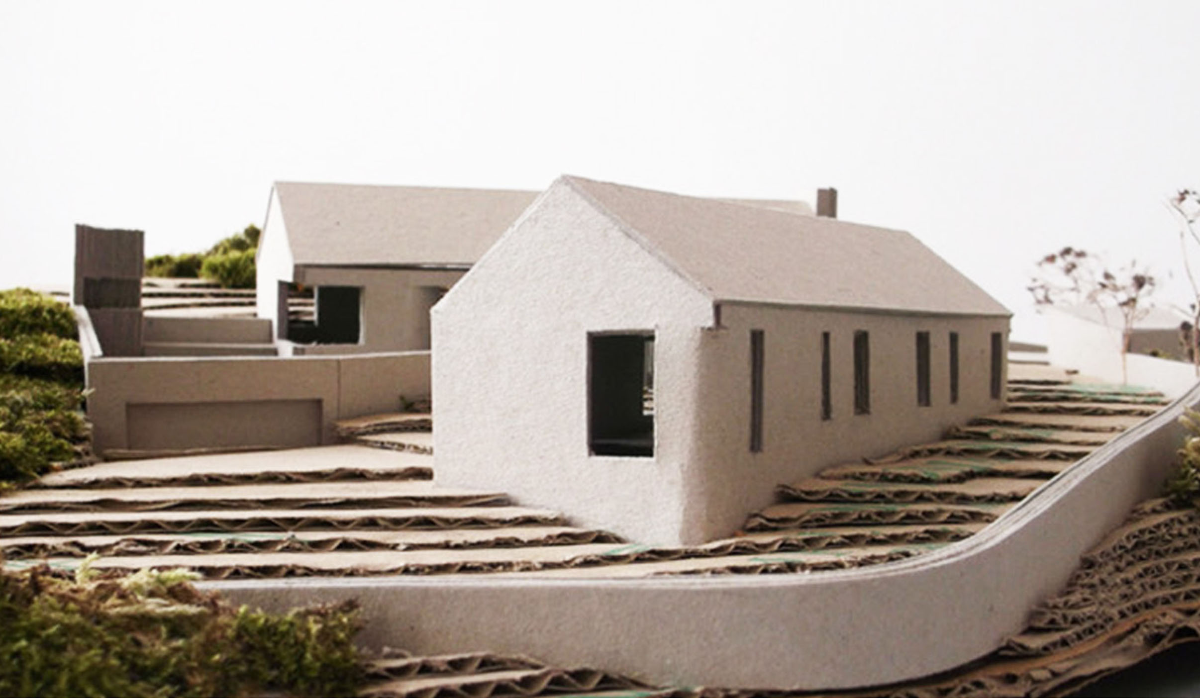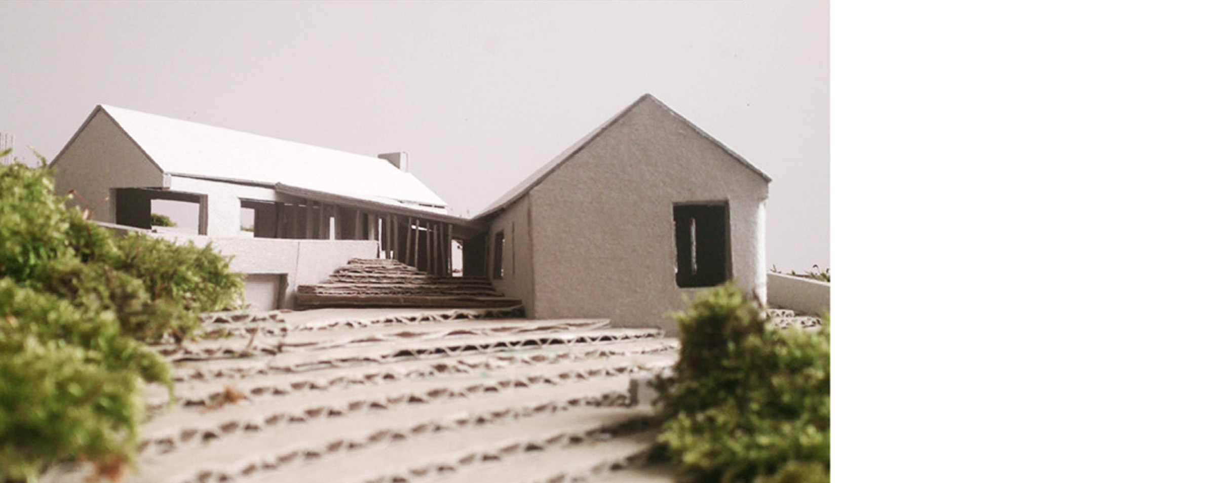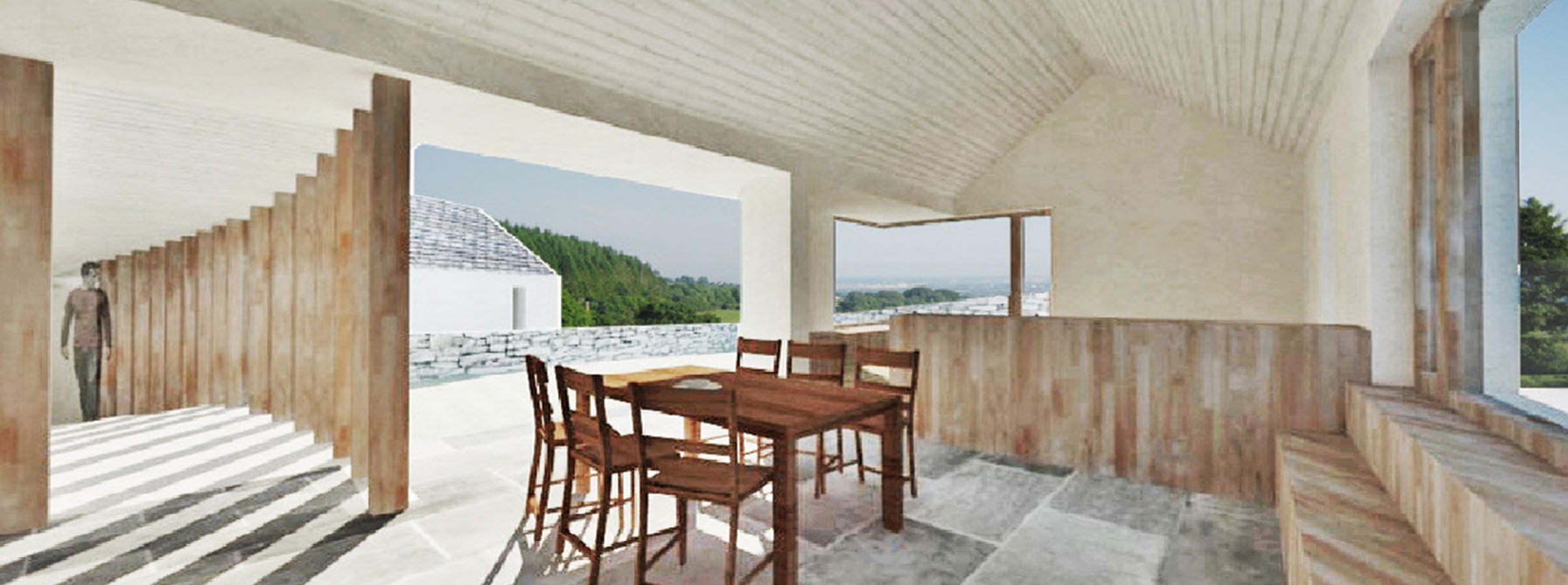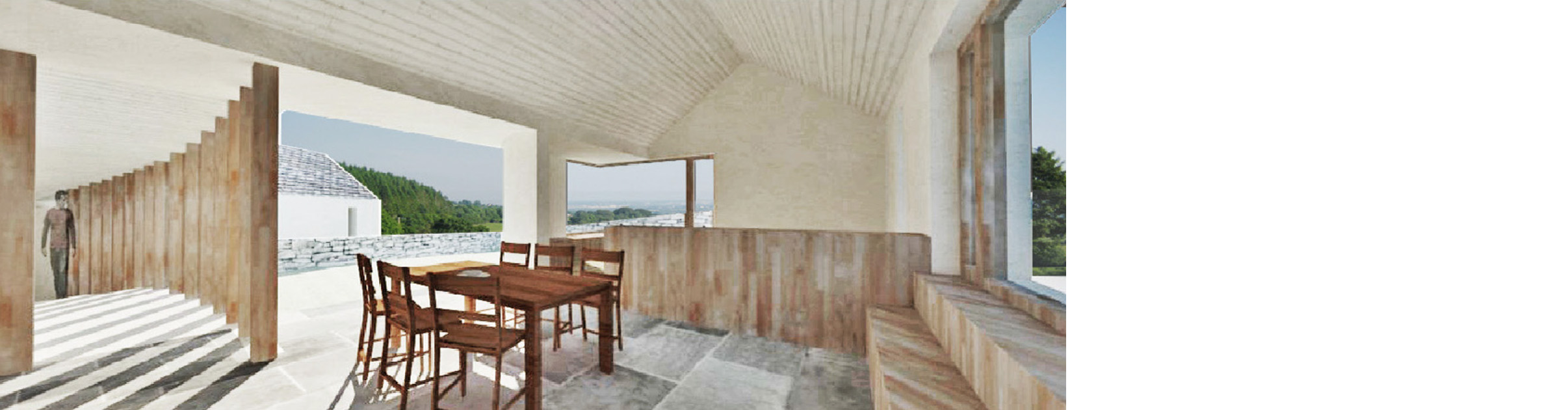 To the south, the main living area and entrance opens toward the distant Dundalk Bay and Louth lowlands, while an evening room faces North–west toward Sliabh Gullion and the setting sun. Bedroom windows face the rising sun and have an immediate aspect of the coniferous slopes of ‘The Gap of The North’. Two small gardens are treated as external terraces that extend out from living spaces, allowing the existing terrain to meet embedded rooms at window sill level.