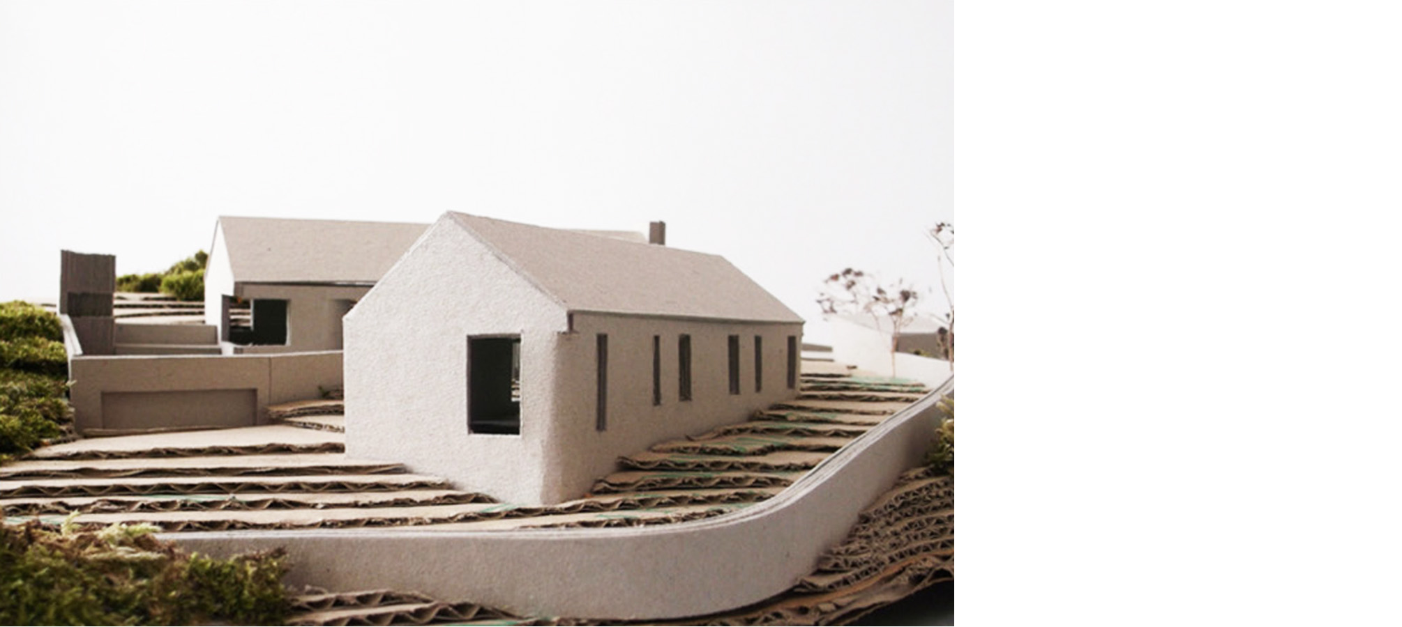 The lower slopes and hills of the Ring of Gullion are characterised by rocky outcrops covered with dense yellow flowering thorny gorse. The proposal for this farmhouse began with an intention to preserve as much fertile land as possible. This strategy sees the house set within the rocky topography and heavy gorse typical of the South Armagh hillsides, which in turn will help to embed the building and screen it from surrounding aspects in this ‘Area of Outstanding Natural Beauty’