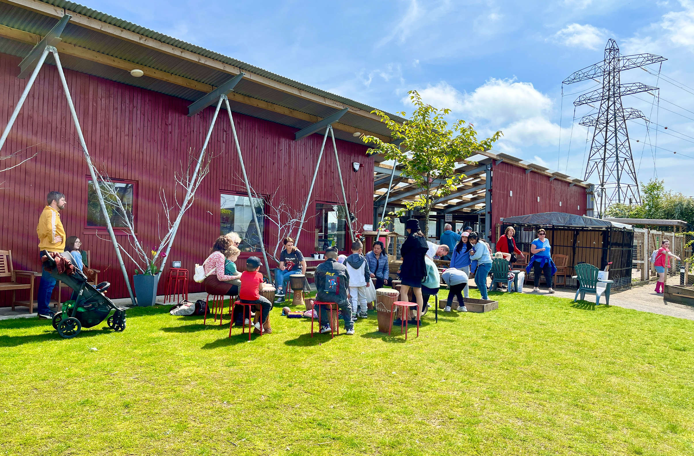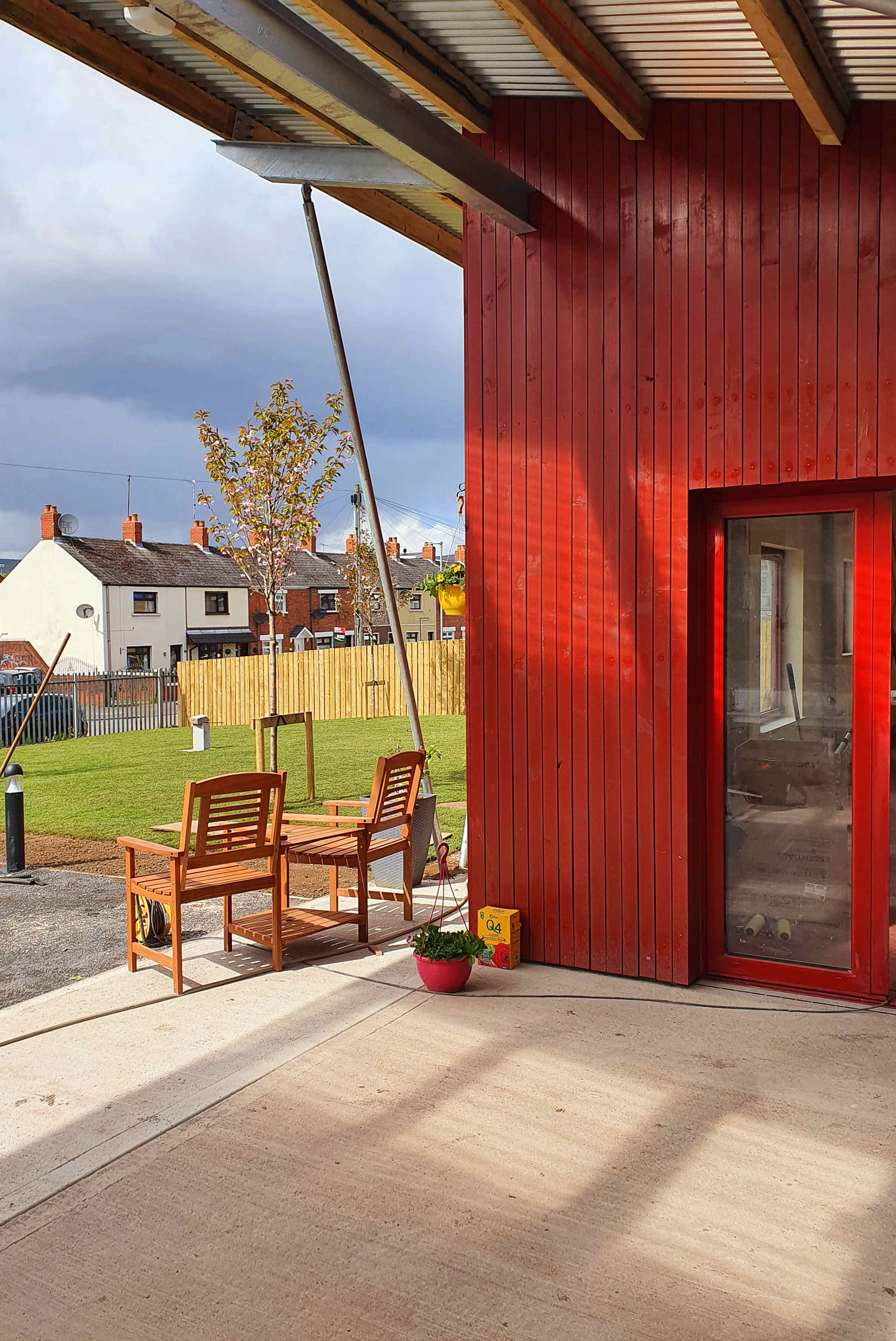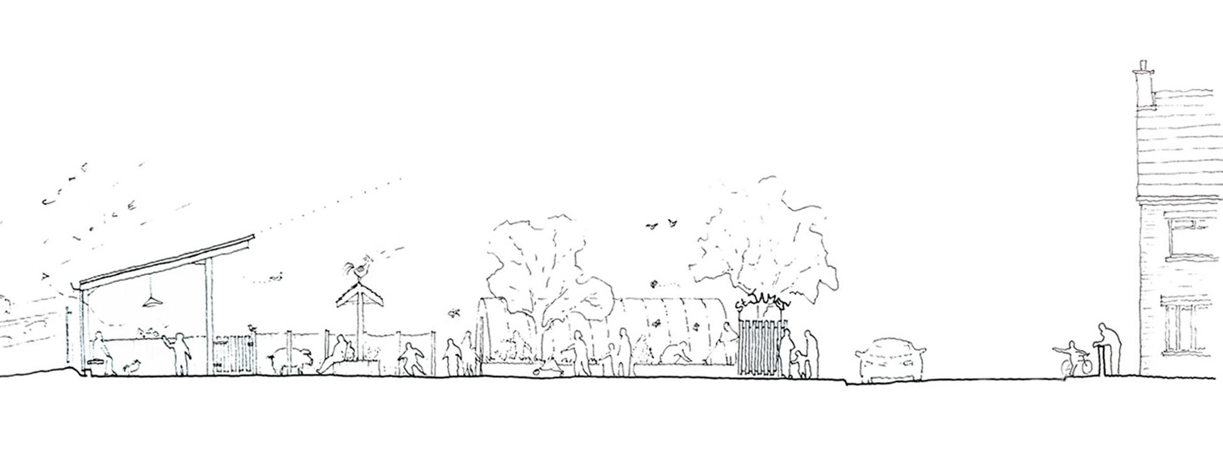The design intention was to use a simple mono–pitch form to shelter a central community garden space protected from the noise and fumes of the dominant adjacent motorway, yet opened to surrounding terraced streets and the wider aspect to Belfast Hills and setting sun, to create a micro–climate conducive for growing, playing and community performances, discussions and events.
