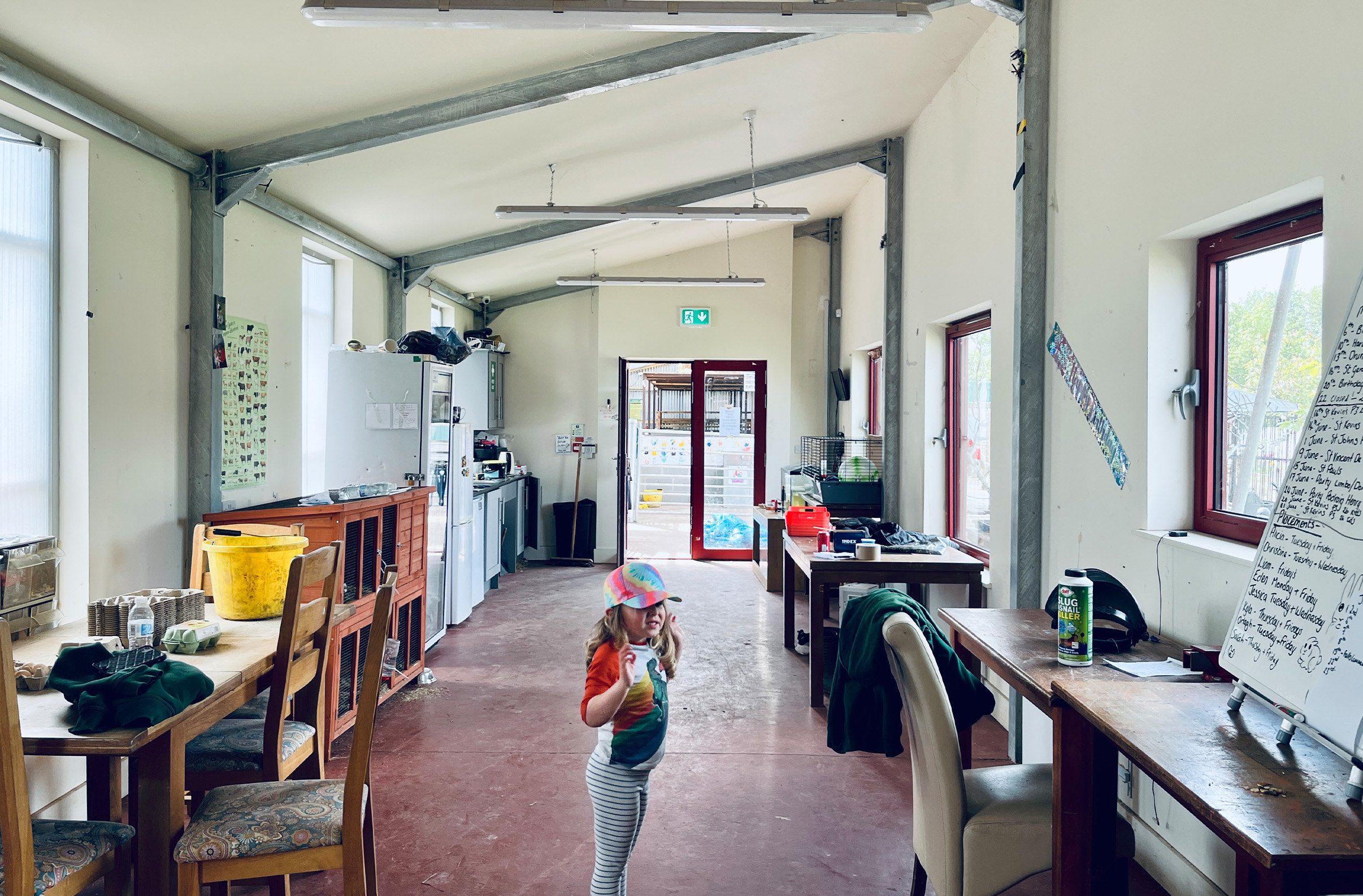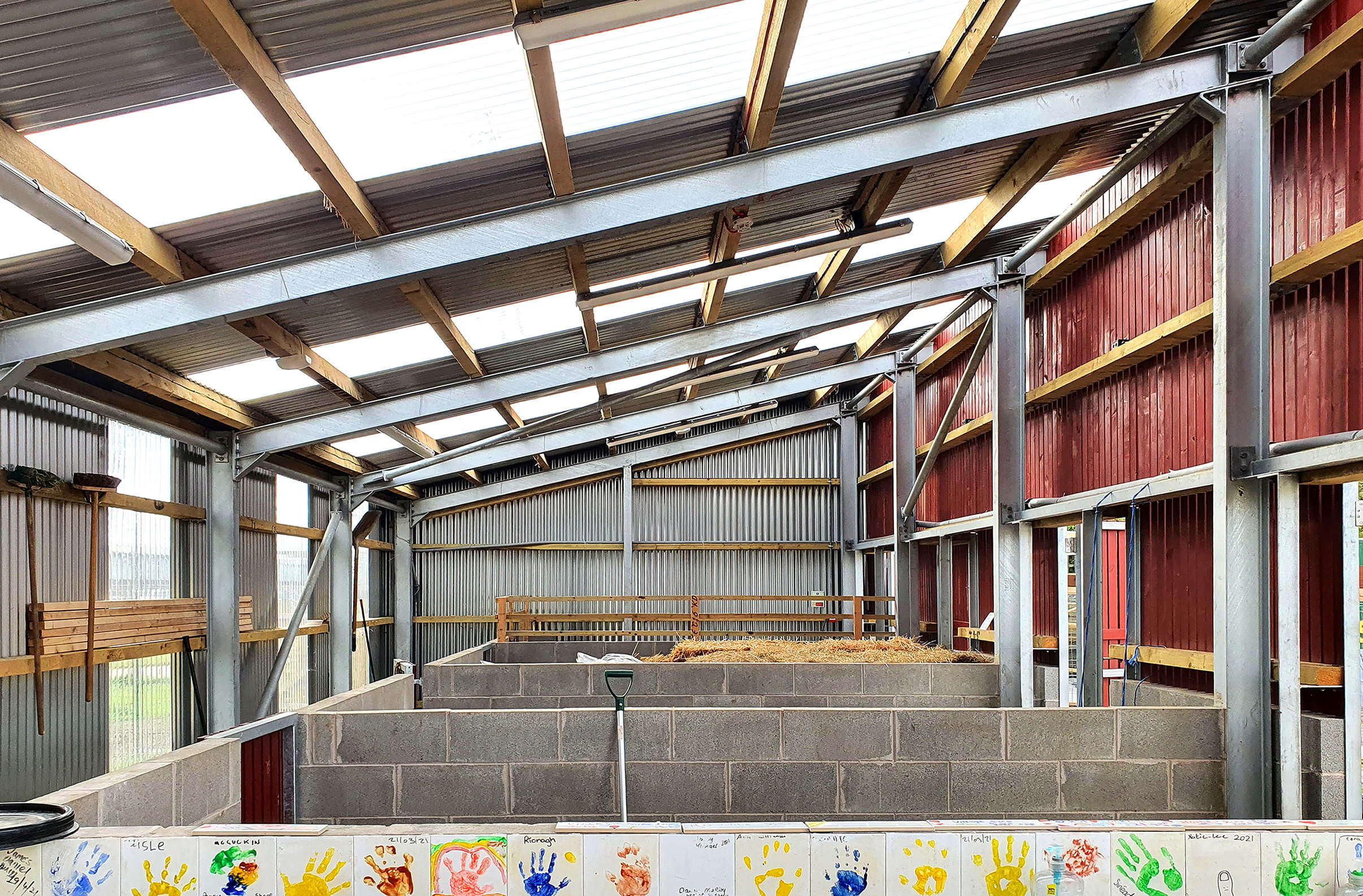 Within a central bay of the linear portal frame, a covered space is left open between the animal stalls and workshop and orientated to the sun setting over the hills. This is the farm’s heart, a space for events and gatherings – but also about everyday farm functionality – with large sliding gates to open to grazing ground and passing public in the Bog Meadows.