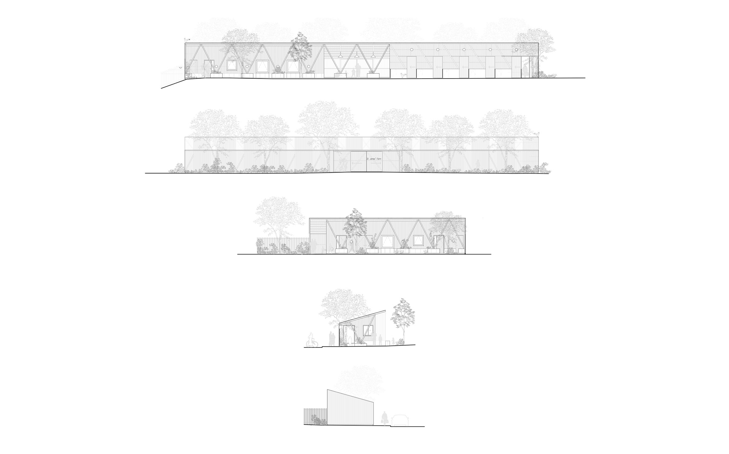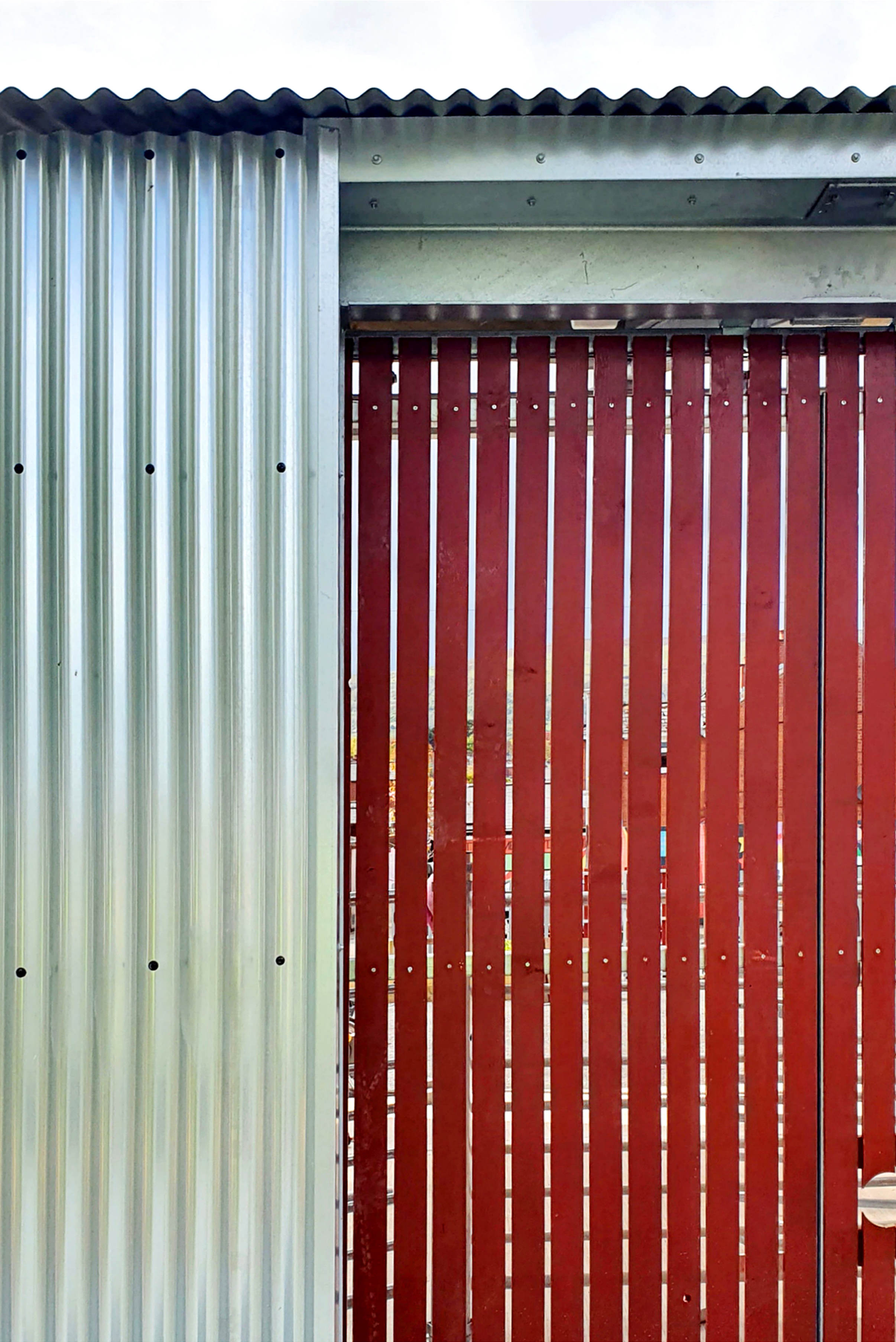 The outside edge of these typical agricultural portal frames is clad in corrugated, reflective metal to make a robust and secure ‘shell’ to the harsh environment of the motorway, while the inner facade to the main farm and garden is softer and more tactile, clad in timber gifted to the farm by a local builders yard and painted in a ‘red–oxide’ coloured oil stain. A playful ‘colonnade’ of ‘V’ shaped steels support a projecting roof to enhance enclosure, while giving a heightened expression to the humble building as a hint to its civic role. These columns are to be planted with trellised creeper species, allowing the buildings to embed within the garden as it.