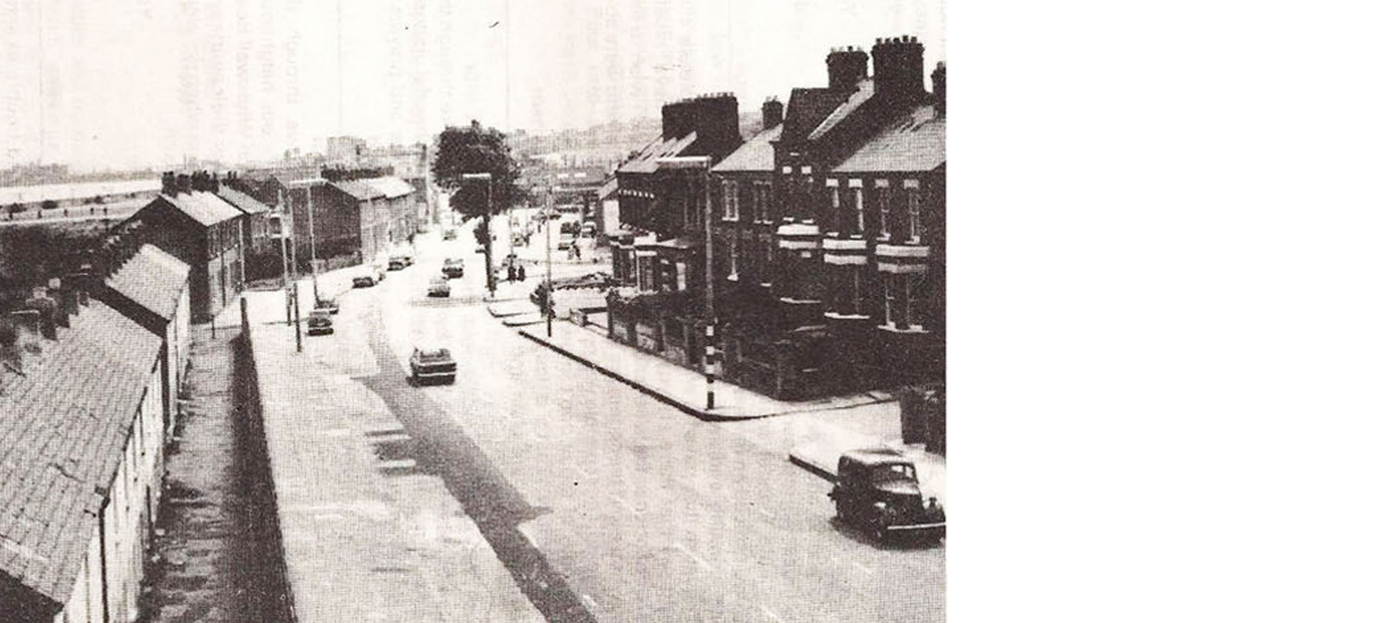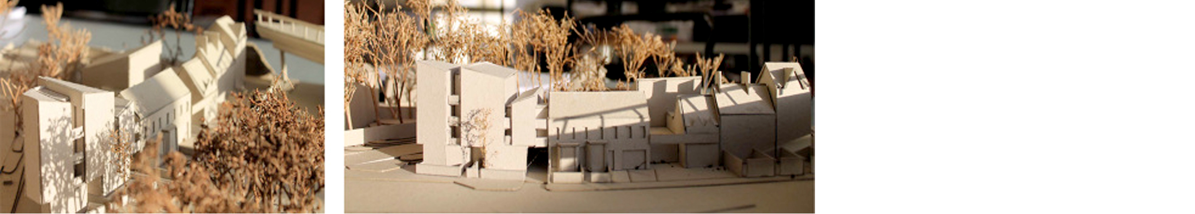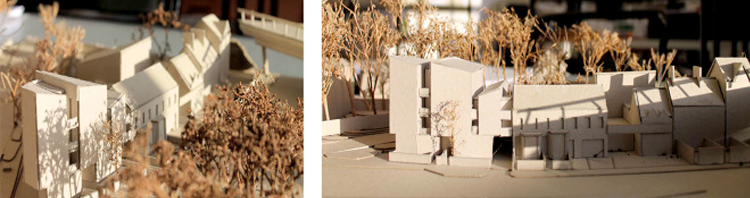 The immediate context around our site is characterized by a variety of 2/3 story terraced housing, new build housing of varying scale and various small businesses. The develop­ment site is located on a piece of leftover ground between two roads. Road infrastructure surrounds the site on two sides; one being the slip road access to the motorway & the second towards the Newtownabbey commercial area. This junction conveys a gateway or nodal aspect to our site. The adjacent terrace is dwarfed by the motorway bridge. A rich strip of mature trees aides with screening and buffering the site to the south and east from the motorway.