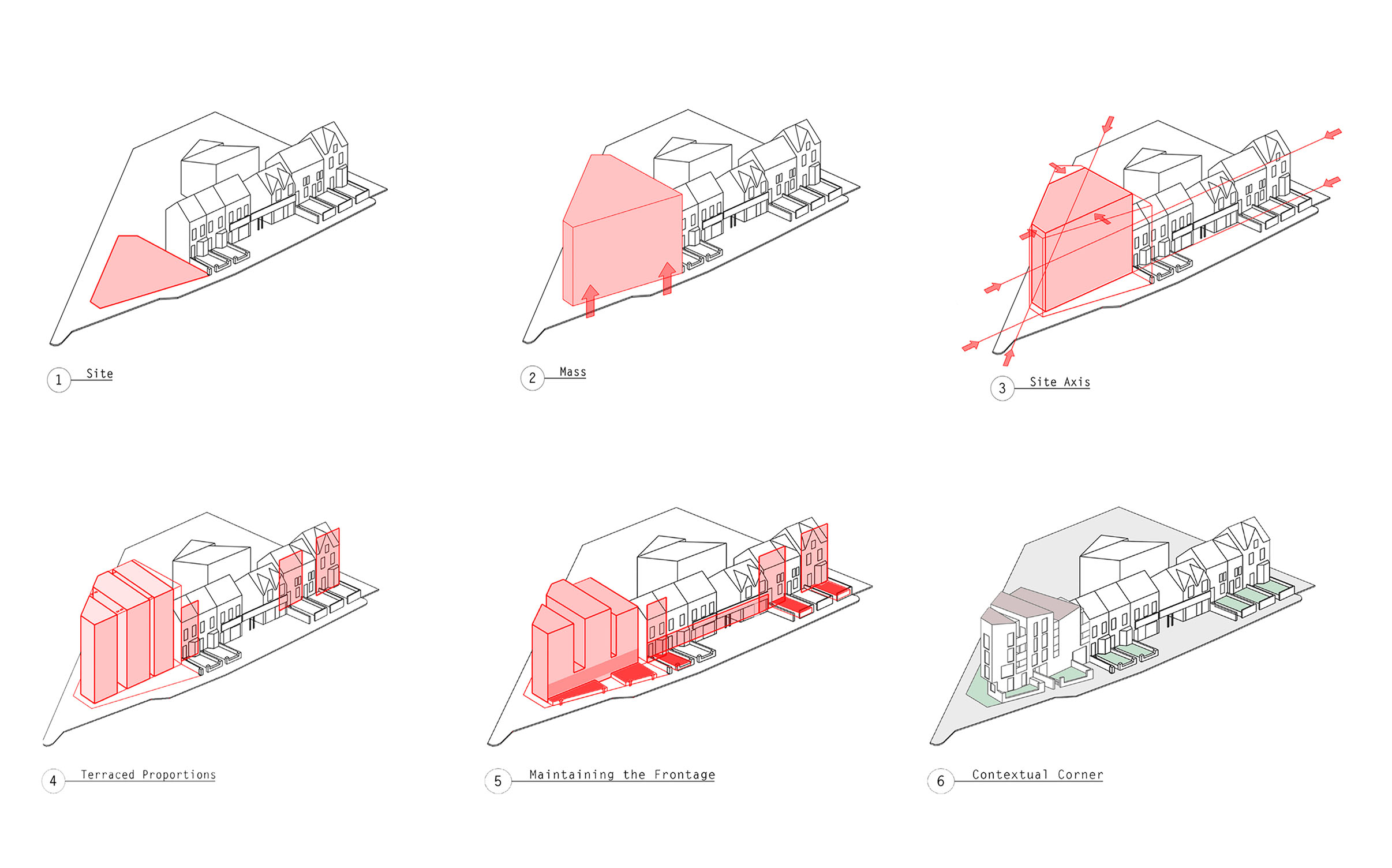 The proposed scheme takes reference of the existing axis points; the existing front and back lines of the terraces, as well as the right of way, parallel to the slipway. In addition to this the heights of each block have also been staggered to further contextualise the project. The smallest of the blocks references a terrace house, whereas the highest block is referencing an already existing apartment oppo­site. As the mass of the full site is extruded up to its highest point, approxi­mately that of a four–storey building, mirroring the existing apartment building that lies directly opposite the pro­posed scheme as mentioned, these moves not only begin to decrease the overall volume of the mass but begin to align it with what already exists, aiding with the diminishment of overshadowing to neighbouring properties.