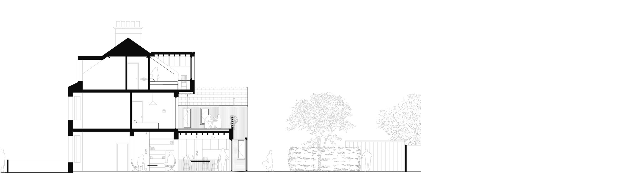 The newly insulated and extended first floor return is clad in black stained timber to allow it to be read as one volume, while relating the new element to the materiality and character of garages and garden sheds of surrounding rear back land. Also clad in black timber, the new pitched roof dormer form is to be read as a pair with the extended rear return.