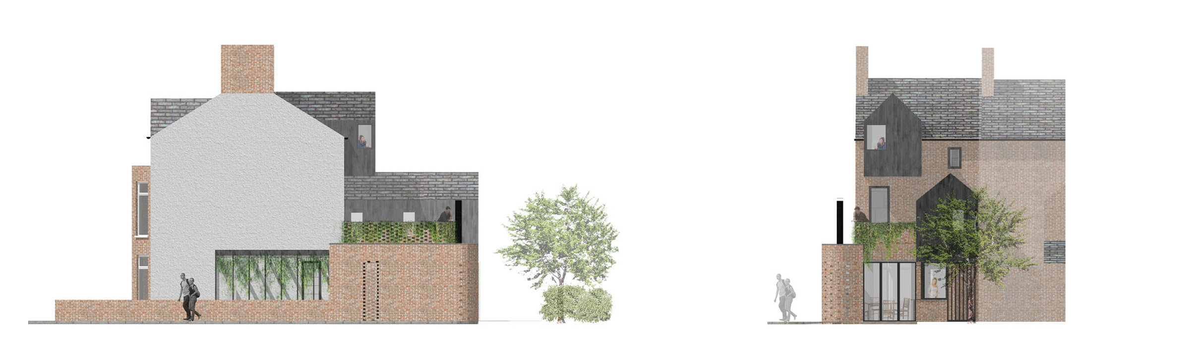 The boundary wall of the property is extended and manipulated to create a new living space off the kitchen on the footprint of the existing rear yard. ‘Hit and miss’ brickwork allows the proposal to meet the floor path directly, while maintaining privacy and security. It also mediates between light views and privacy for the first–floor terrace, while providing a structure for greenery to grow up and through. The textural effect refers to the expressive brick details of Belfast red brick Victorian architecture.