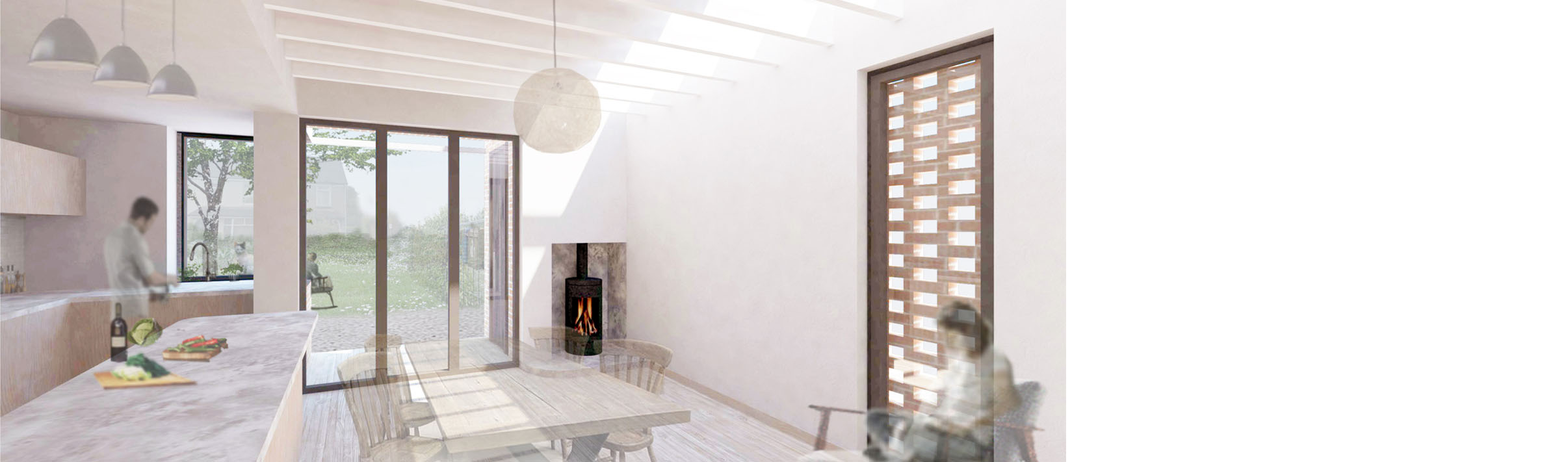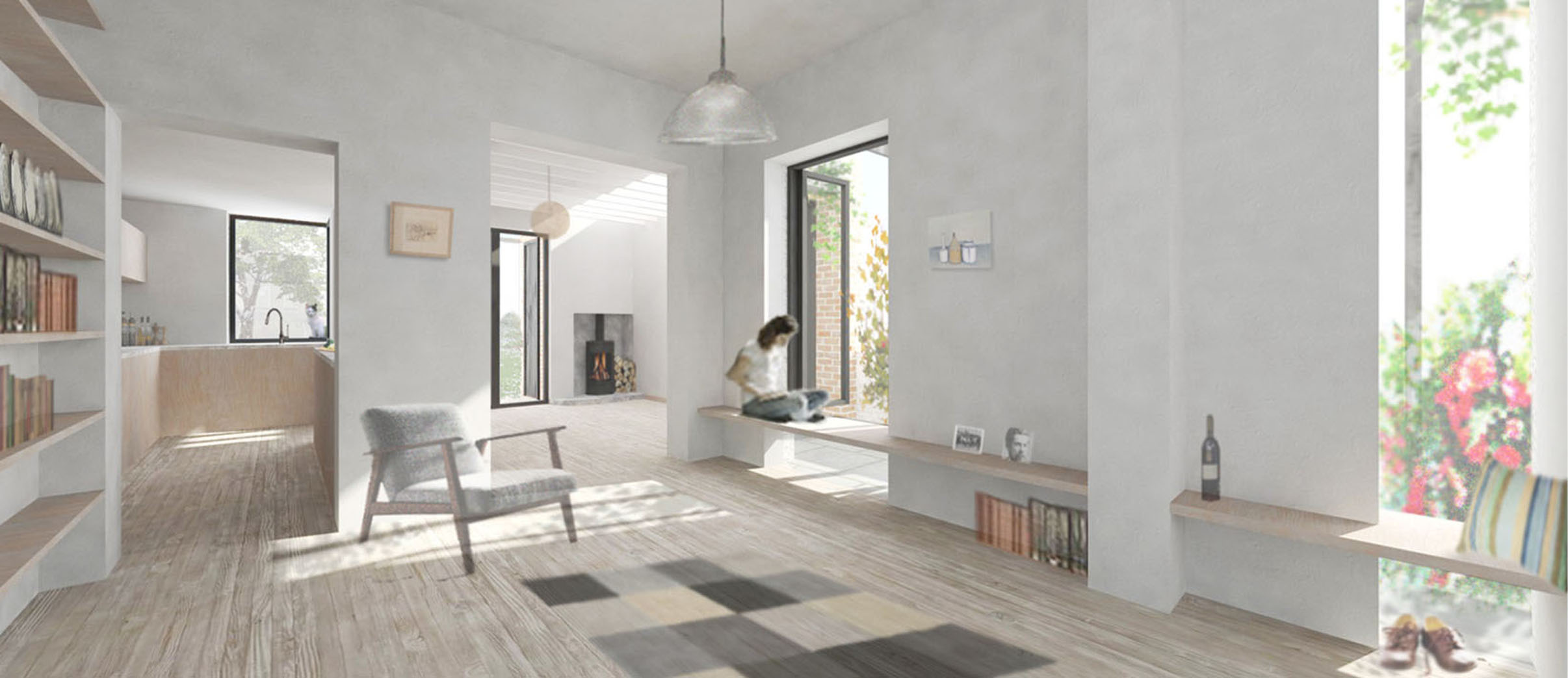 In the living room new windows and window bench / shelf allow the existing space to be transformed with south light and will open it to the ‘greenhouse’, which will in turn act as a winter garden, heating the living spaces via solar gain on sunny winter days. The planting from this conservatory will give the existing living space a leafy character, filtering direct south sun through into the room.