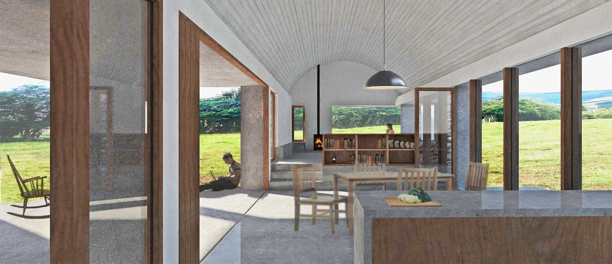 This material forms the primary structural and spatial element of the latest adaption, taking the form of raised plinths and an expressed column grid that defines internal and external spaces. Between the columns is infilled with a varying rhythm of either re–used rubble stone from a demolished outbuilding, or large hardwood windows, depending on appropriate views, light, intimacy or openness. The columns are connected with a continuous ring beam in the same in–situ concrete, that in turn supports the base of the barrel vaulted roofs. These copper barrelled forms refer to surrounding rolling hills, while also striking a kinship with the curved metal roof of the outermost outbuilding in the cluster, helping to unify the new into the whole.