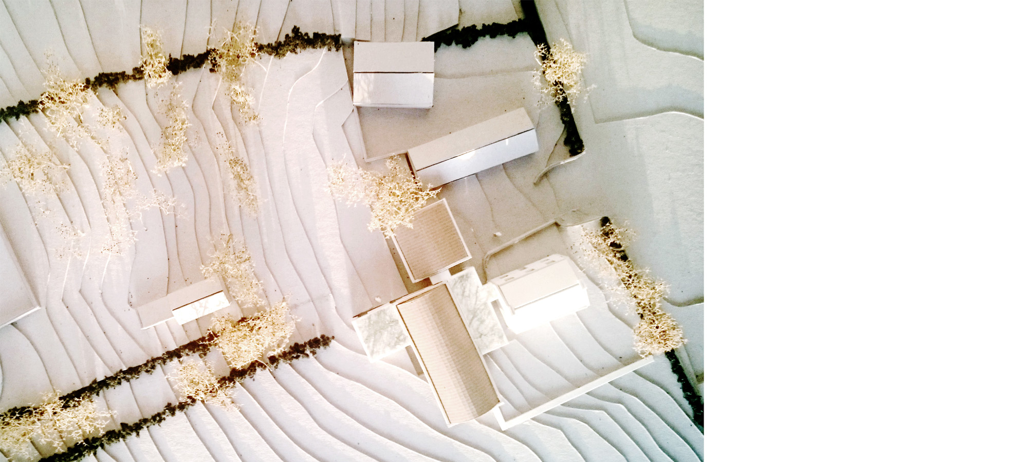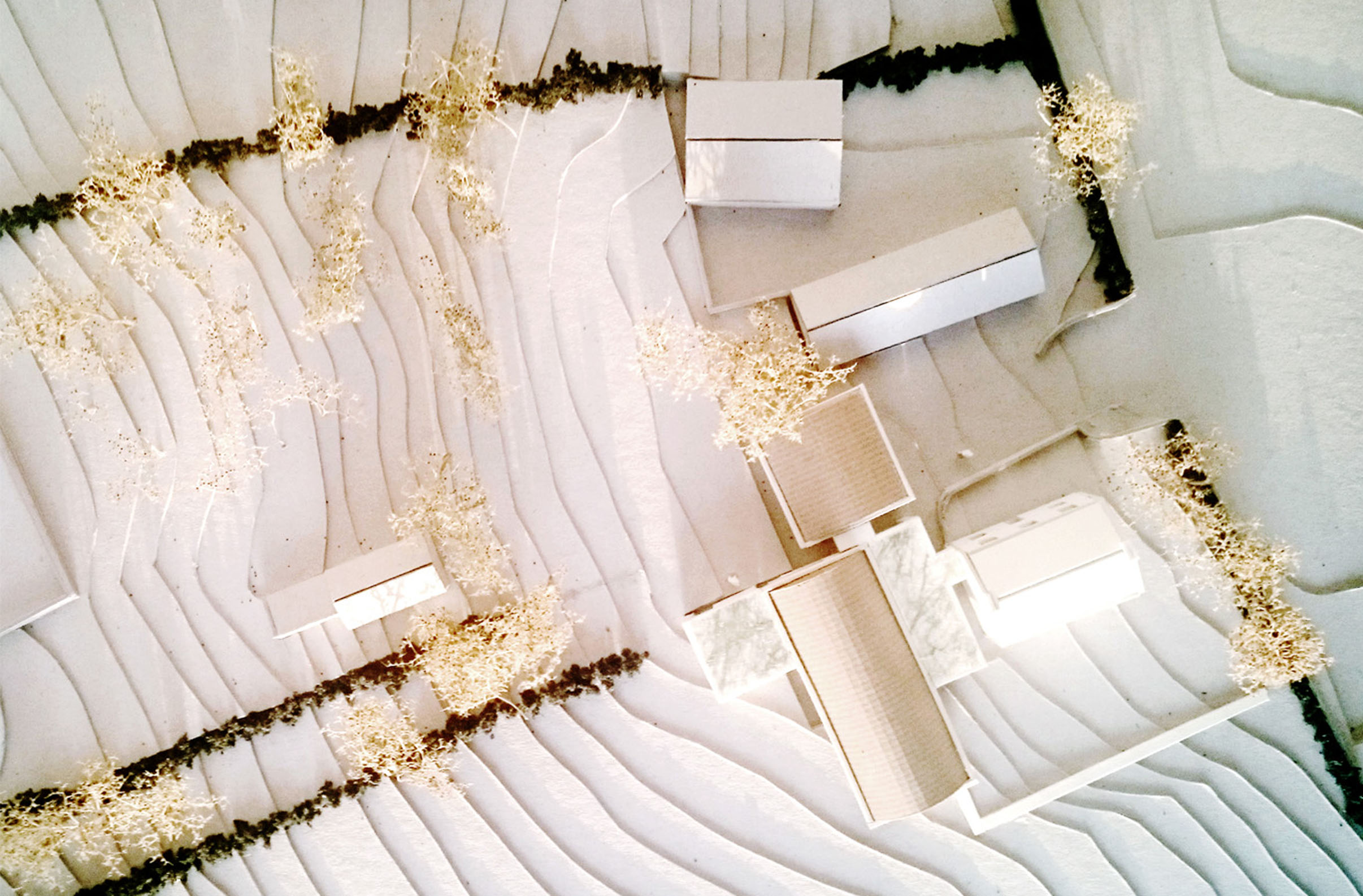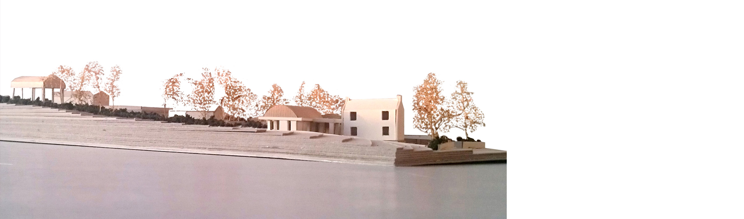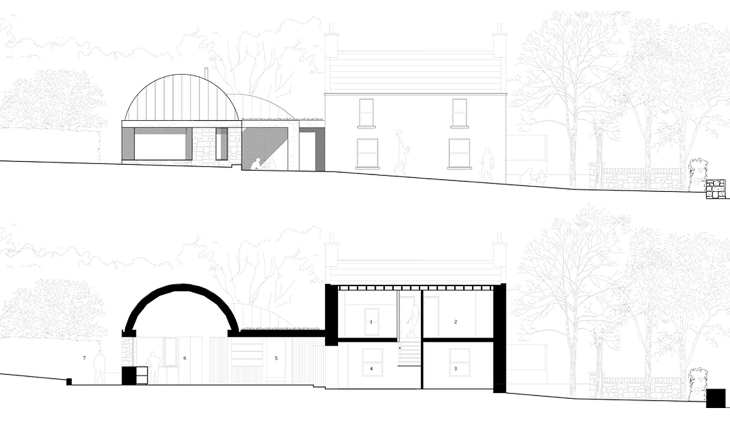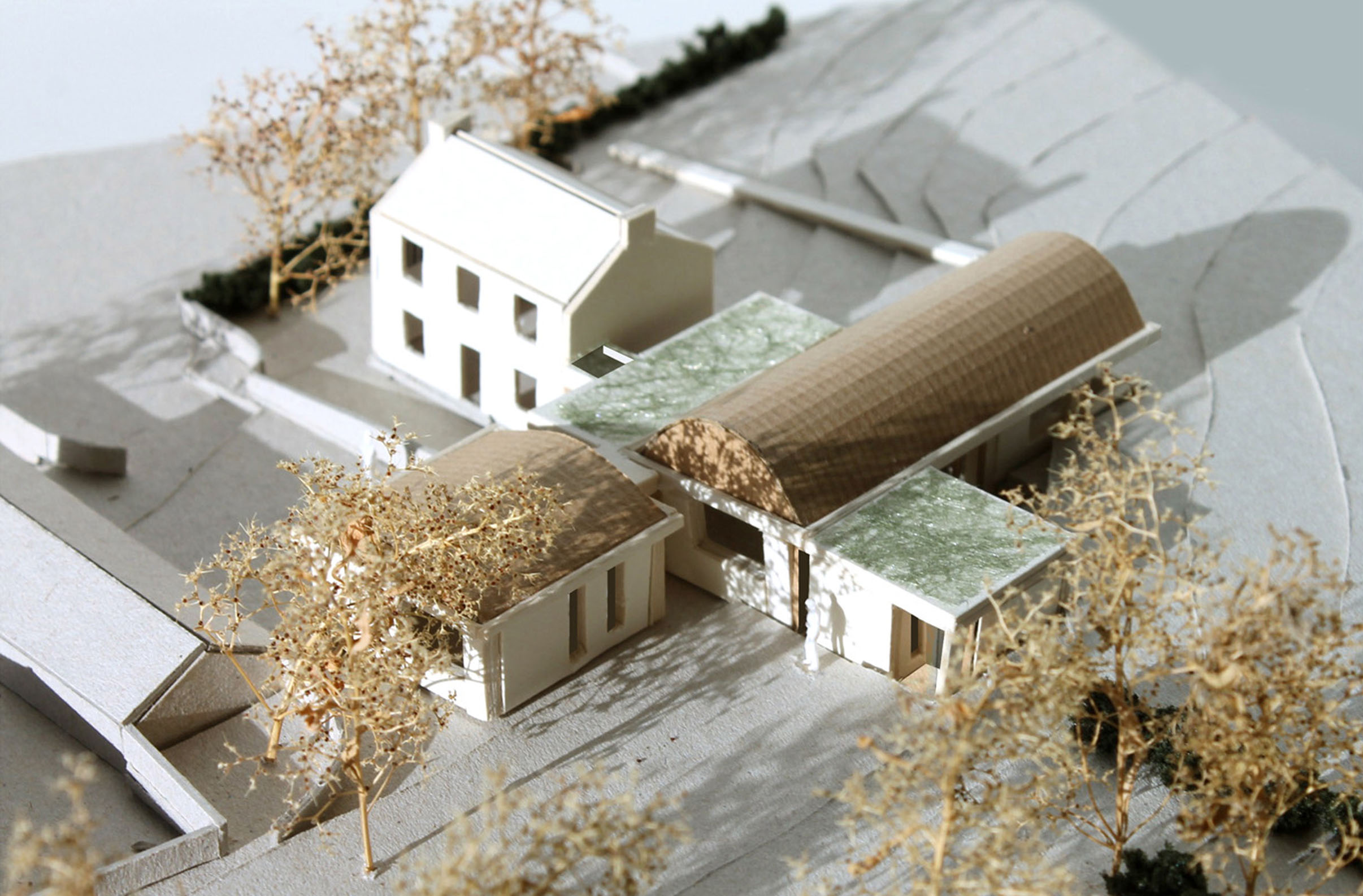 Internally, new vaulted rooms have a soft yet lofty spatial quality, and as the floor rises and falls with existing ground levels, the resulting compression or contraction of floor to ceiling height adjusts the degree of intimacy appropriate to various spaces.
