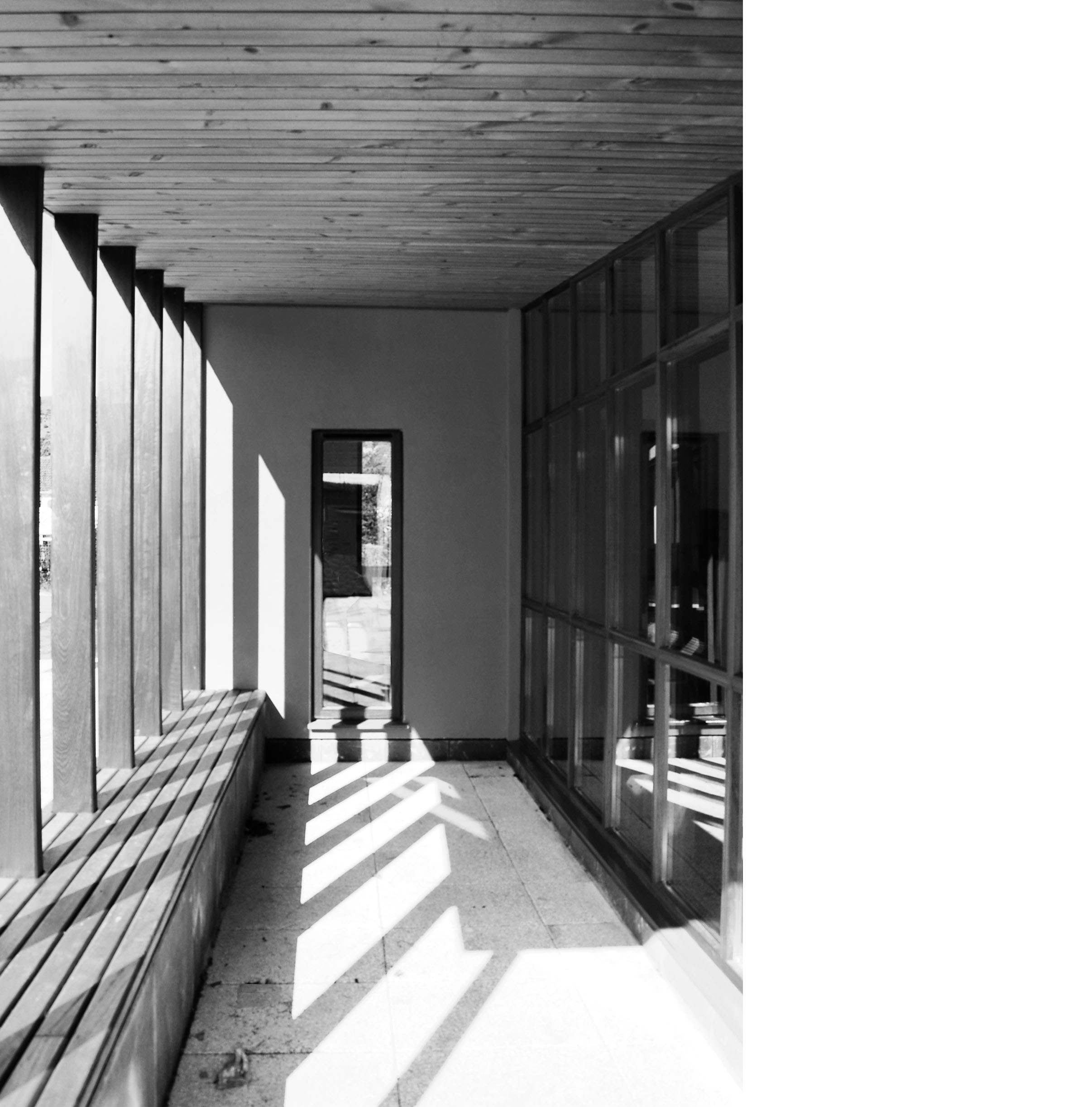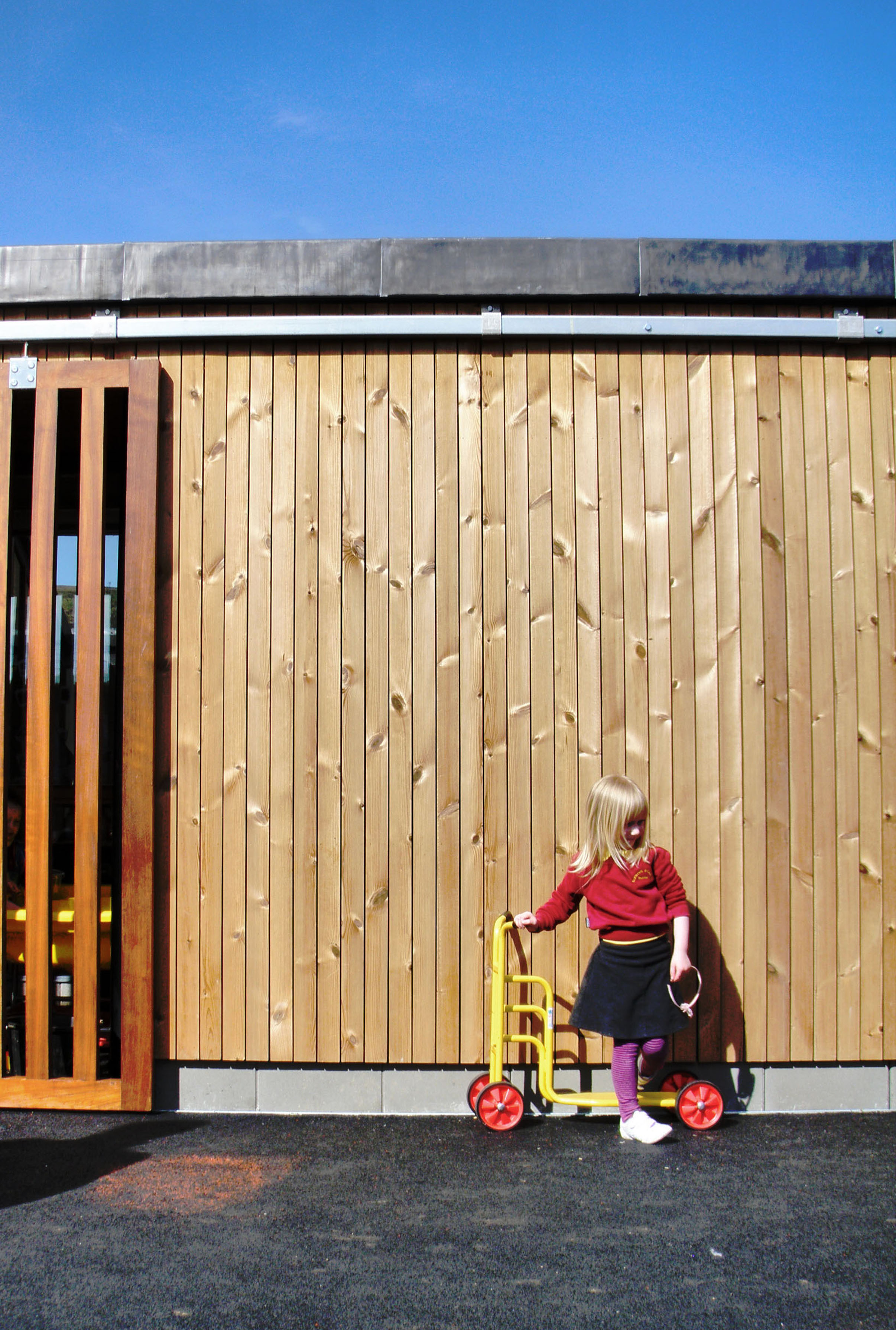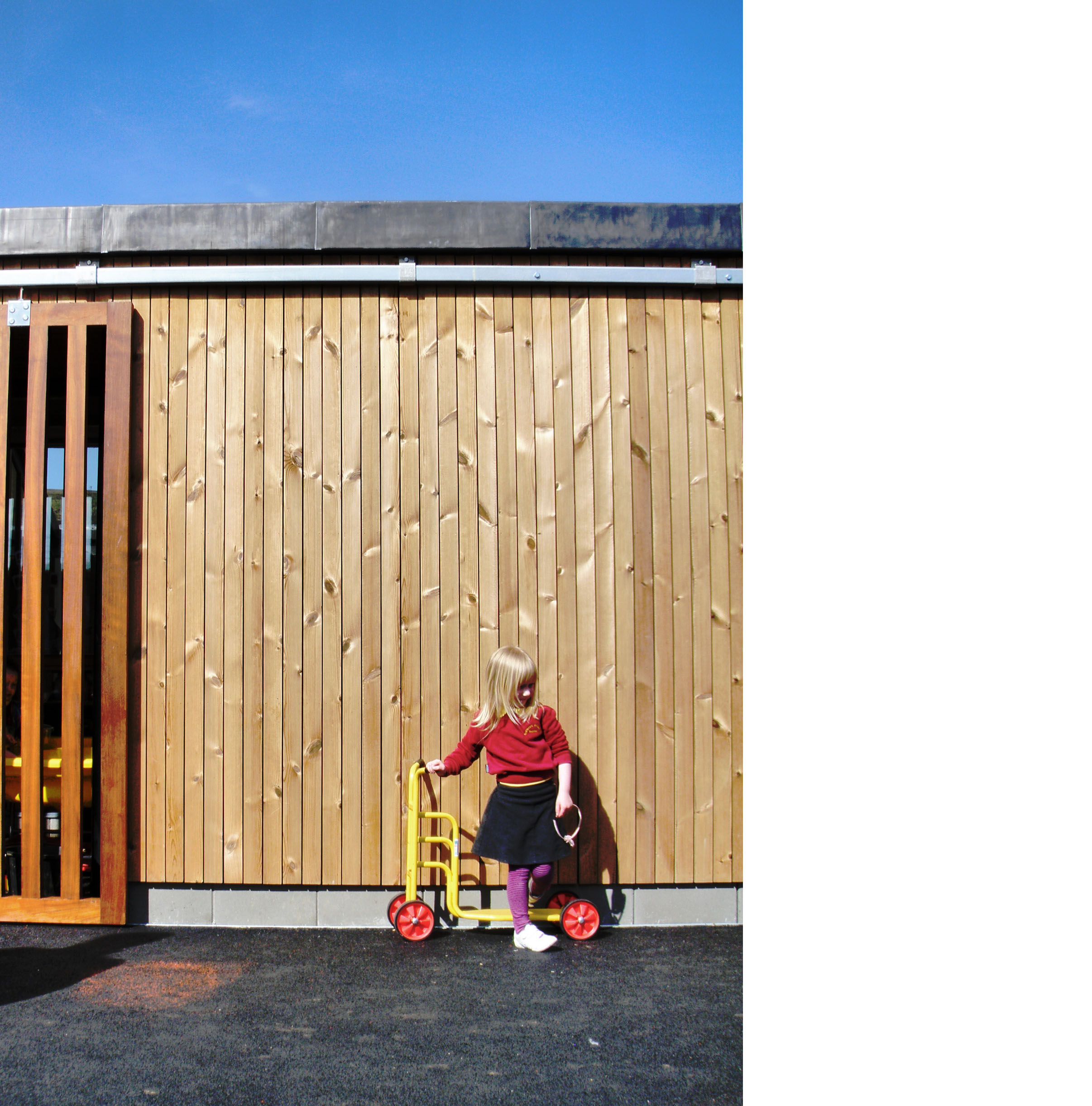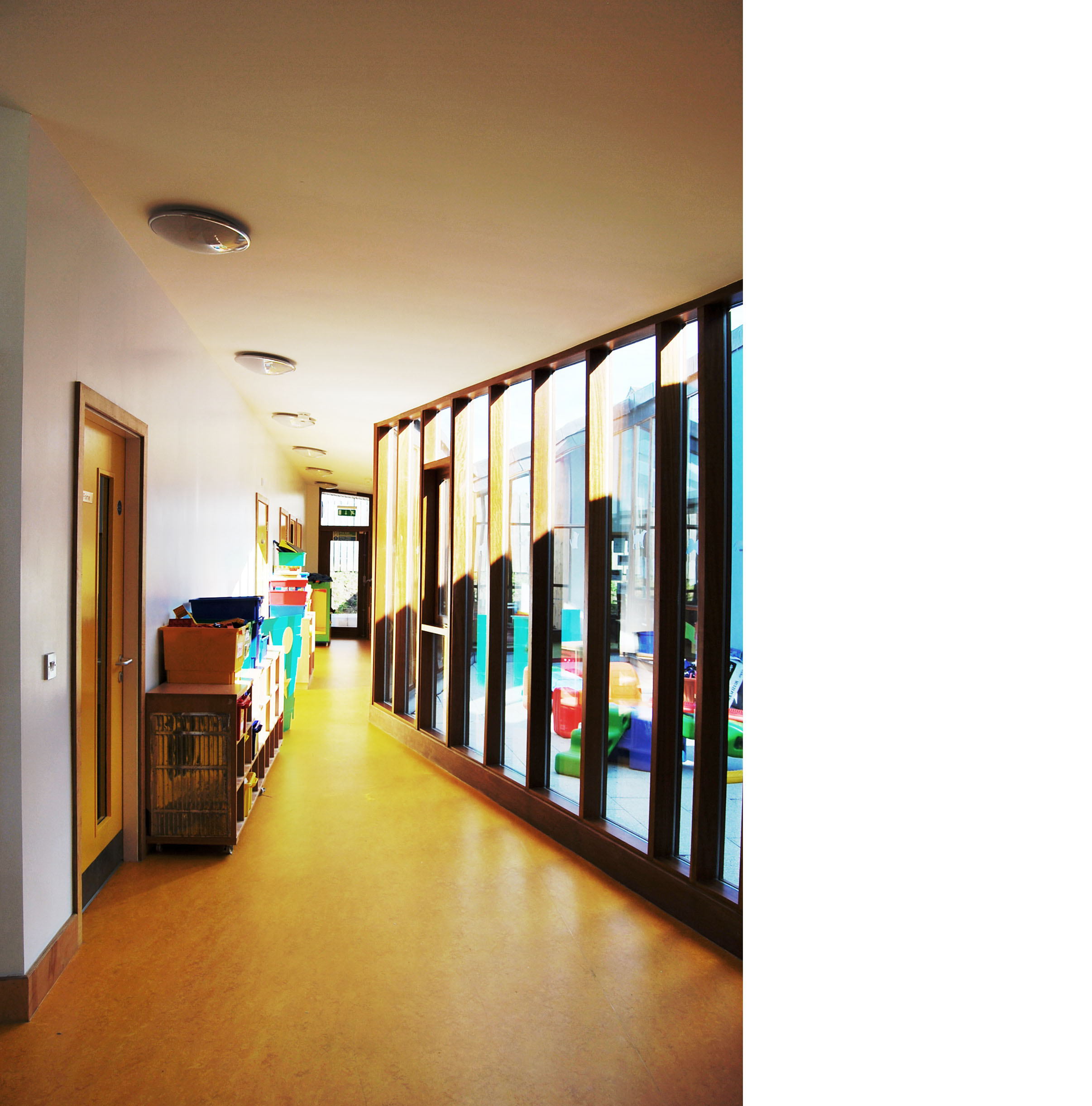 The secluded and intimate courtyard is hidden from view on approach and provides a sense of light and space in the heart of the school. A ‘spine’ (staff) element slips out from an otherwise square plan to signify the entrance. Here the roof plan extends to form a timber canopy and the solid plinth is extruded to form a seat, creating a place of shelter and interaction for waiting parents.