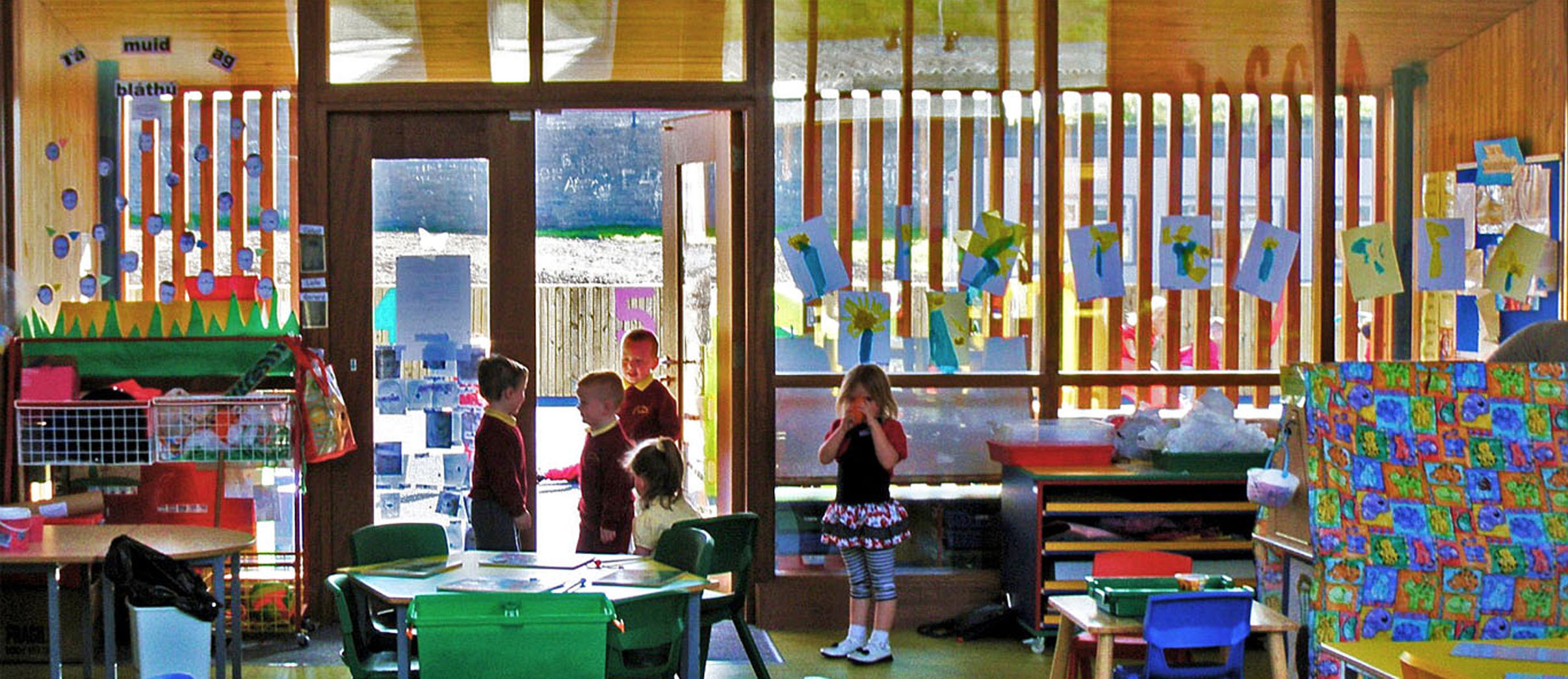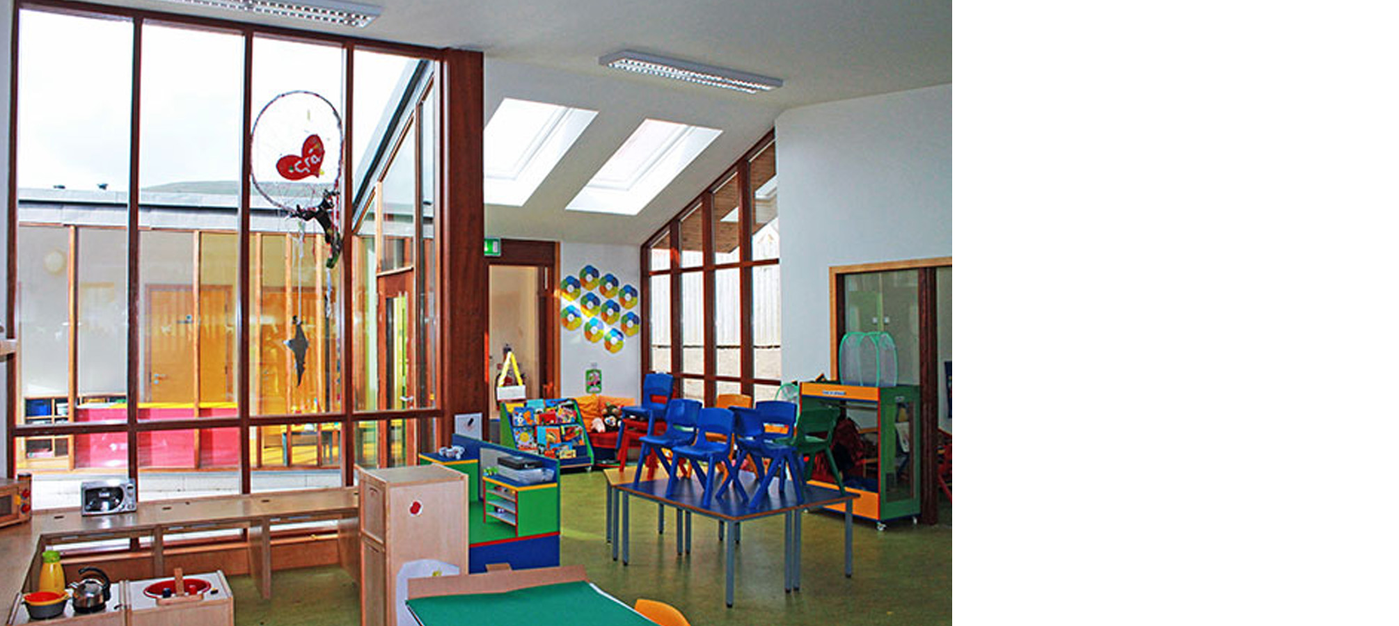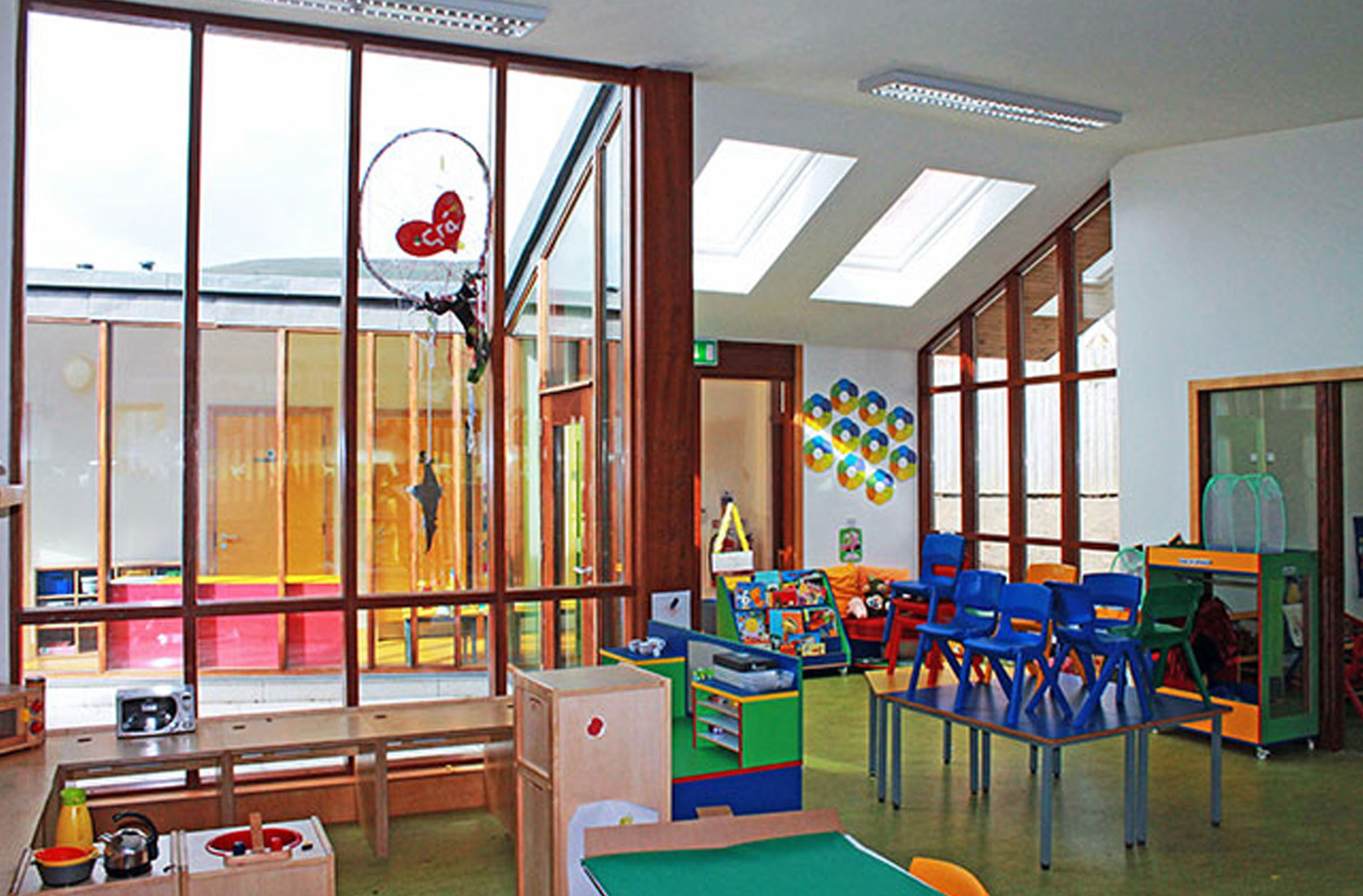 The plan for this nursery school in West Belfast is arranged around a central courtyard, the holistic heart of the school. Each learning space is orientated to fully benefit from controlled daylight and passive solar heat gains at the appropriate time of day. The built form and contrasting material finishes are articulated to reflect the hierarchy of the spaces and define the elements.