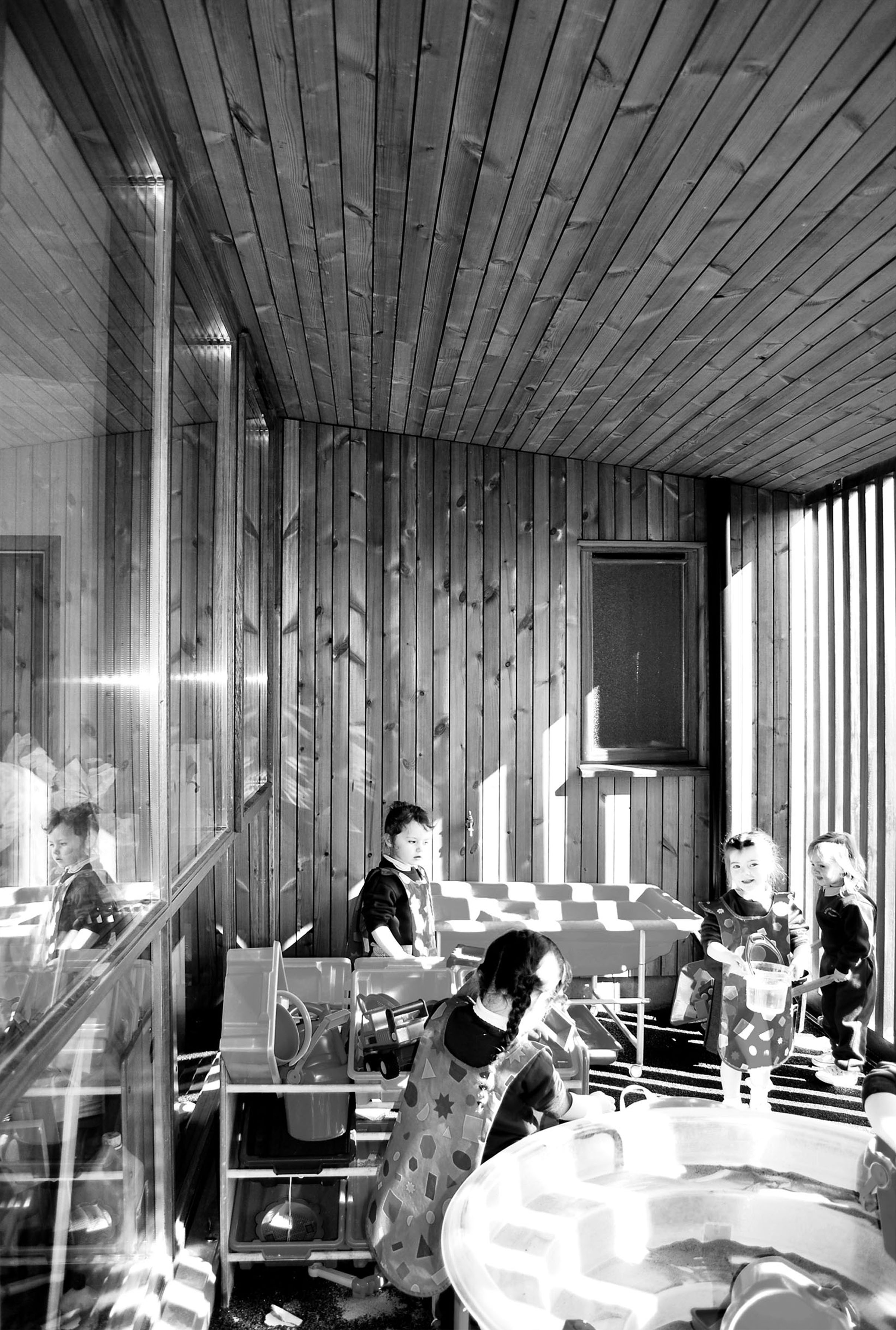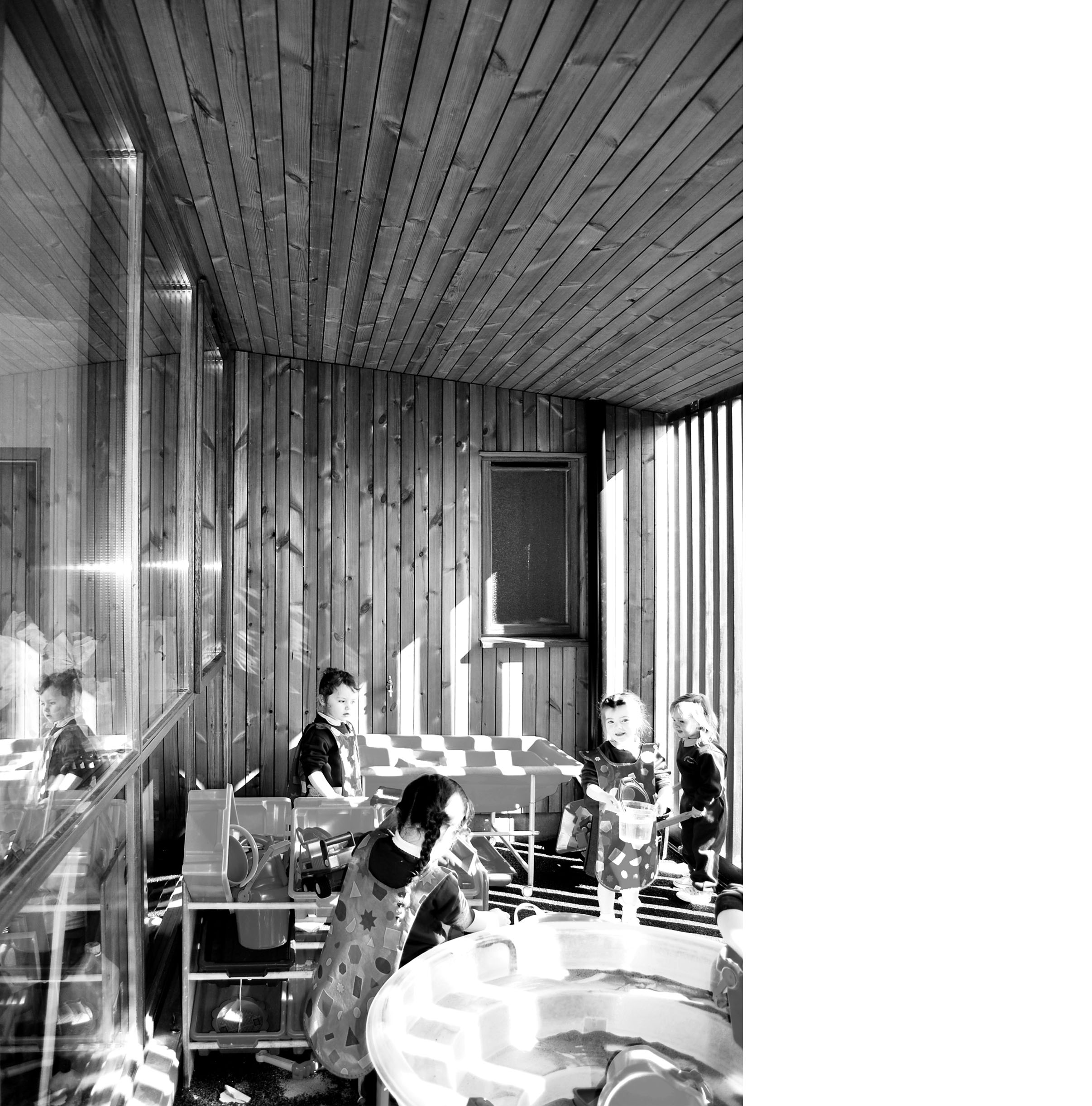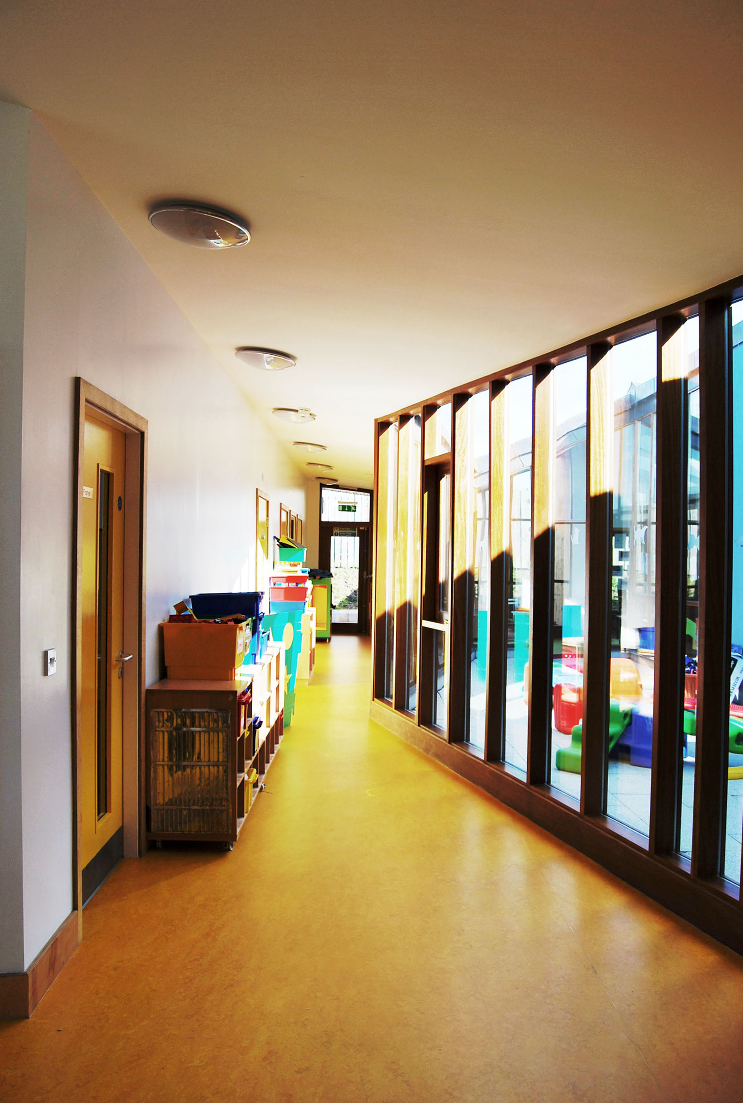 The plan for this nursery school in West Belfast is arranged around a central courtyard, the holistic heart of the school. Each learning space is orientated to fully benefit from controlled daylight and passive solar heat gains at the appropriate time of day. The built form and contrasting material finishes are articulated to reflect the hierarchy of the spaces and define the elements.