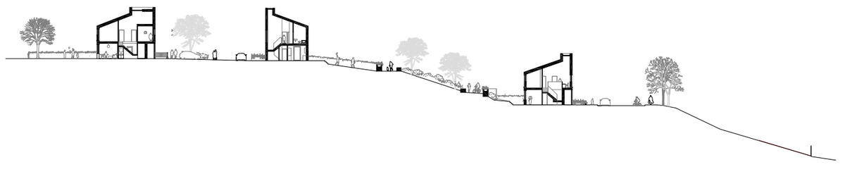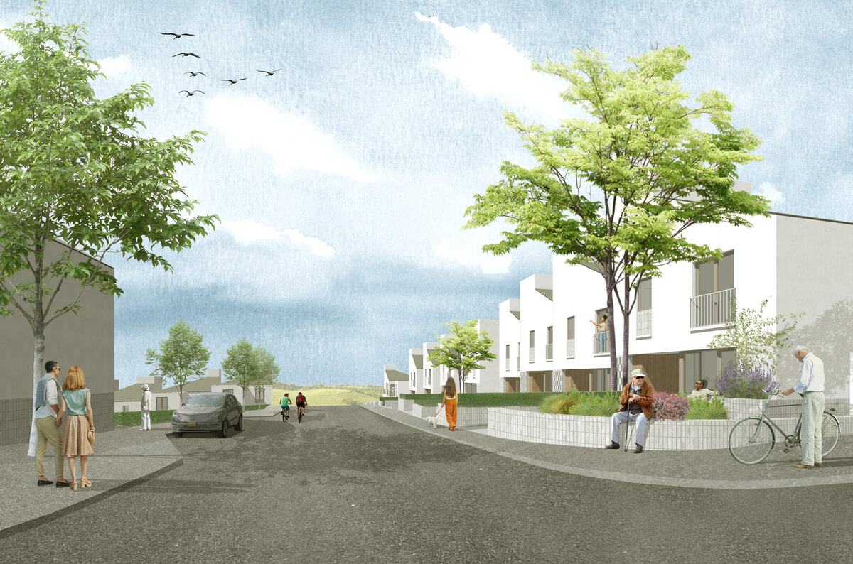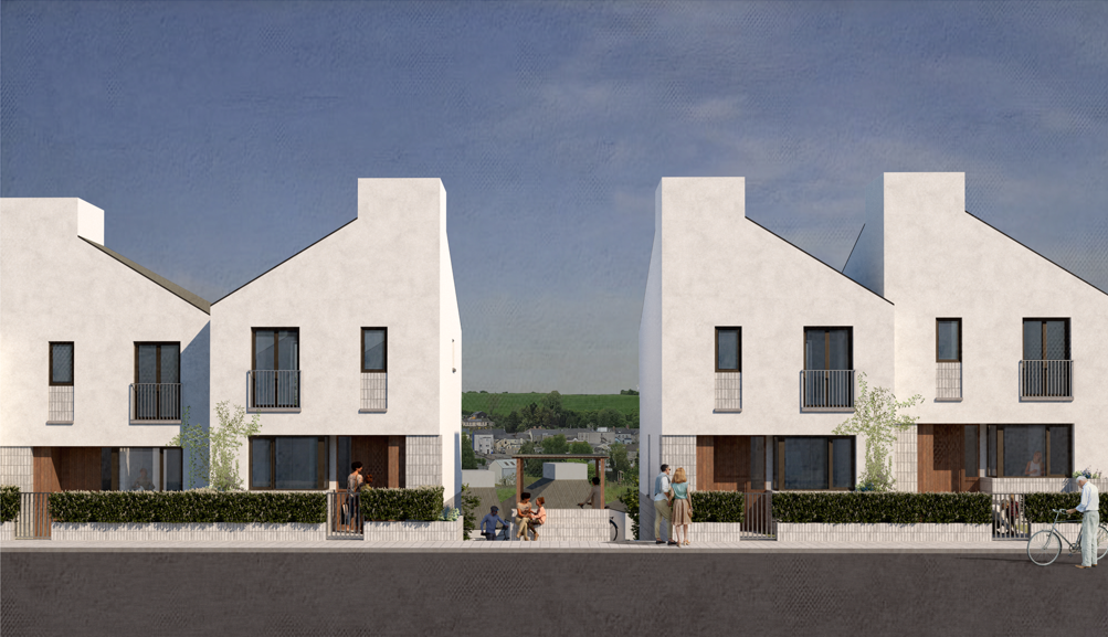 The proposal constitutes a transition between town and rural to establish appropriately scaled connections within these varying contexts. Grounded in its place, the scheme works with the topography, with housing rising with the contours, similar to the town settlement and how that developed. A strategic landscape approach was conceived, with a centralised biodiversity corridor incorporating seating and play elements which all dwellings overlook, mitigating the steep incline whilst providing connectivity between houses and streets and increasing passive surveillance. This active green space intends to foster a sense of community for relaxation and enjoyment, including a safe car free environment for children to play in.