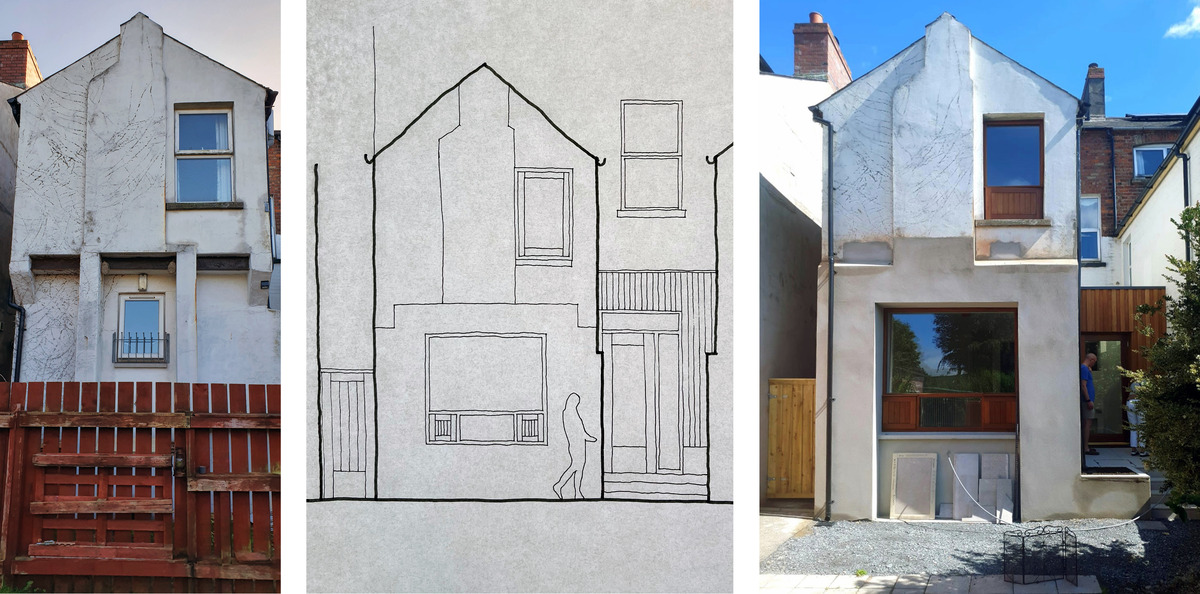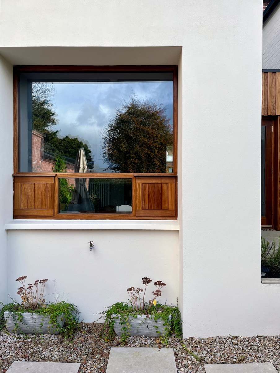 Externally, iroko cladding forms the envelope of new construction and limestone flags pave the yard and steps to the garden. The garden–facing window is set deep into the wall, providing privacy along a public right of way, while from the garden it acts as a moving image – reflecting moving clouds and swaying trees throughout the seasons.