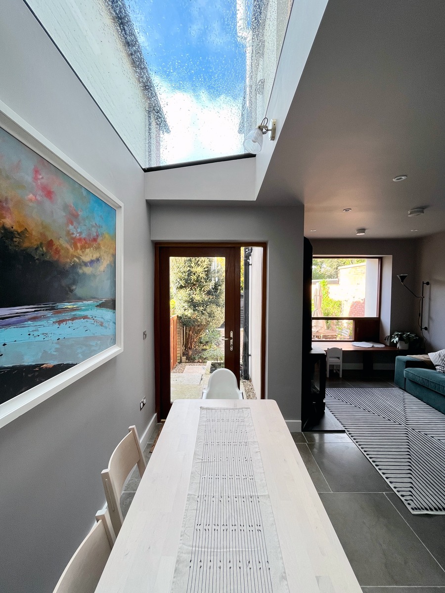 A treasured dining table is placed in the extension, previously a yard, and sits under a large new rooflight, providing a bright place to dine, work from home and play, whilst overlooked by the spacious kitchen.